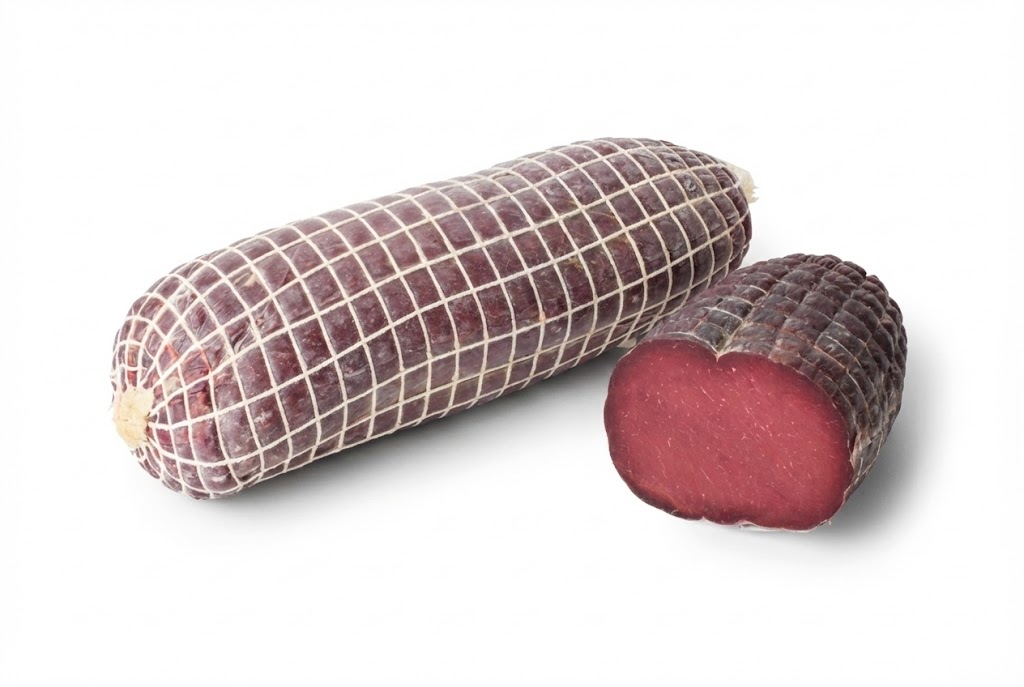 Half piece of aged Bresaola made from beef top round, lean and tender with a rich, savory flavor. Naturally cured for weeks, ideal for thin slicing and light appetizers, pairing perfectly with olive oil, lemon, and arugula